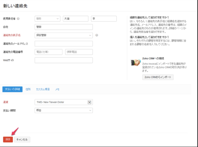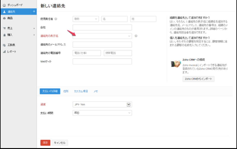 (「使用責任者」だけ入力すると、「連絡先の表示名」には自動で使用責任者が入力され、「会社名」だけ入力すると、「連絡先の表示名」には自動で会社名が入力されます。使用責任者や会社名とは違う表示名にする場合、直接入力して下さい)