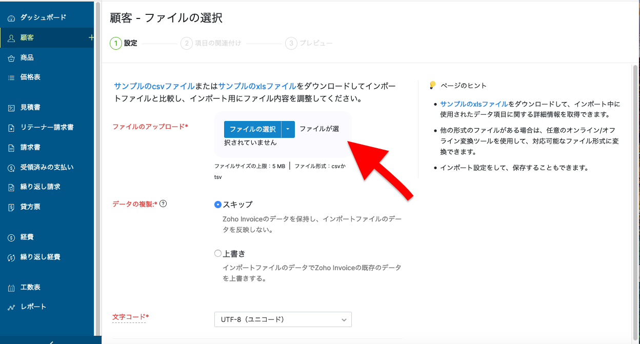 「文字コード」と「ファイルの区切り文字」をドロップダウンリストから選択します。