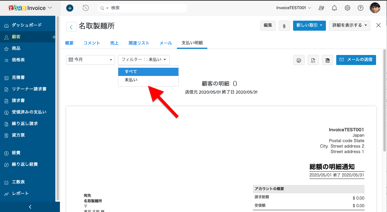 【Zoho Invoice】顧客ごとの未払い明細の表示方法