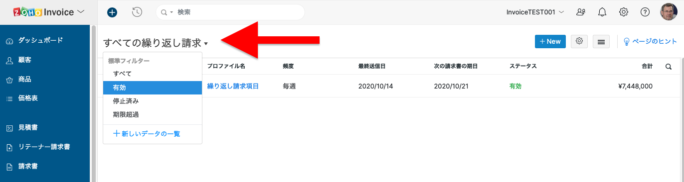 【Zoho Inovice】繰り返し請求一覧のステータスをフィルター