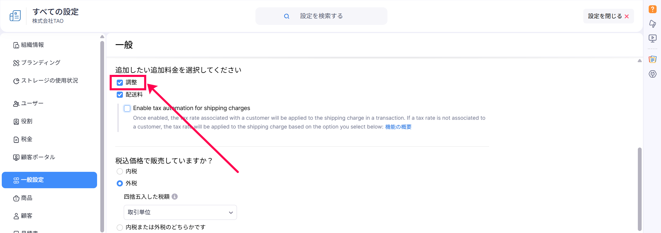 なお、「調整」項目が表示されていない場合は、設定>一般設定画面内の「追加したい追加料金を選択してください」オプションで、以下の「調整」オプションを有効化し、保存します。