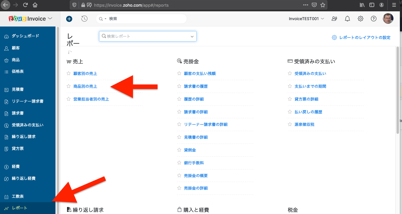 1)「レポート」をクリック