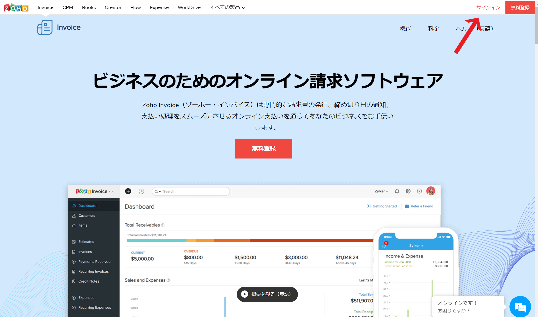 Zoho インボイスのHPにアクセスし、「サインイン」をクリックします。