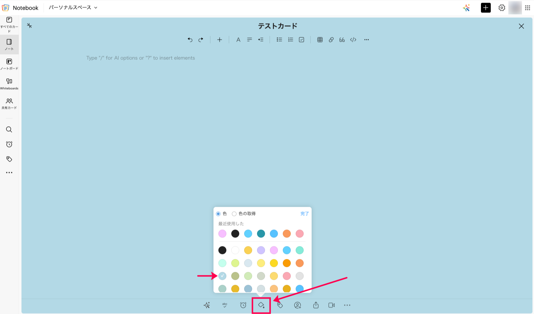カードを開き、画面下部中央のアイコンをクリックし、色を選択してください。