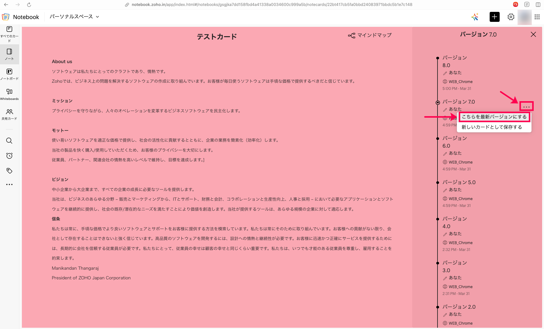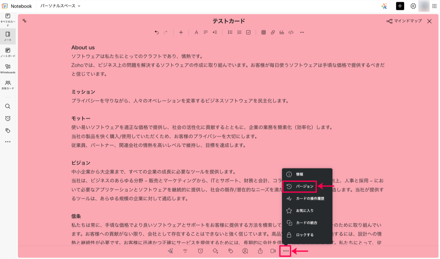 Notebookではカードのバージョン履歴から、カードに記載した内容を過去の特定の時点に戻すことが可能です。