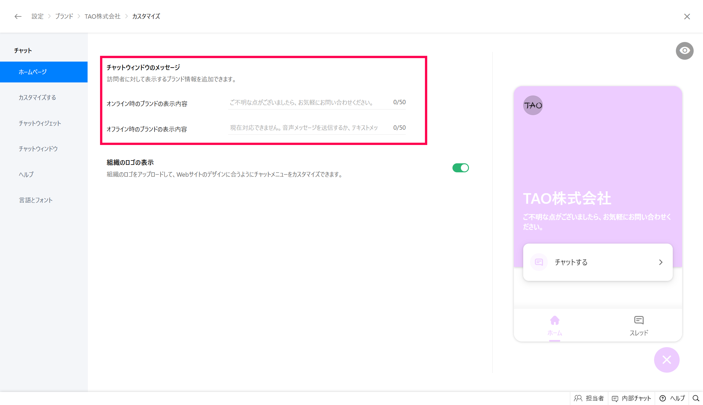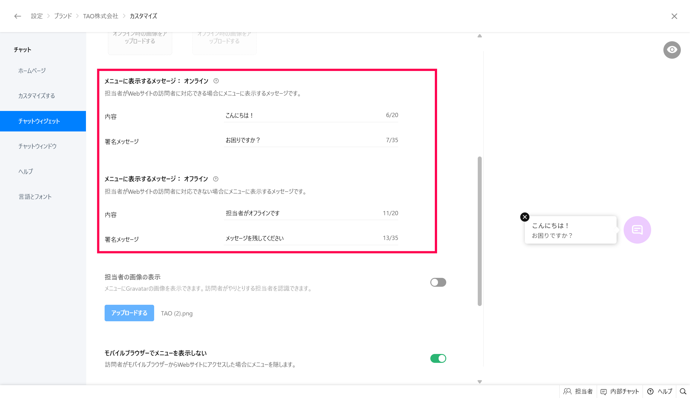 チャットボックスが有効になっているのに表示されない場合は、チャットウィジェットの設定に起因する可能性があります。 チャットウィジェットの設定画面に、「オフライン時にチャットメニューを表示にしない」というオプションがあり、 そのオプションがオンになっていると、営業時間外やすべての担当者がオフラインである場合にチャットウィジェットが表示されなくなります。 どんな時でも表示したい場合は、こちらのオプションを無効化してください。