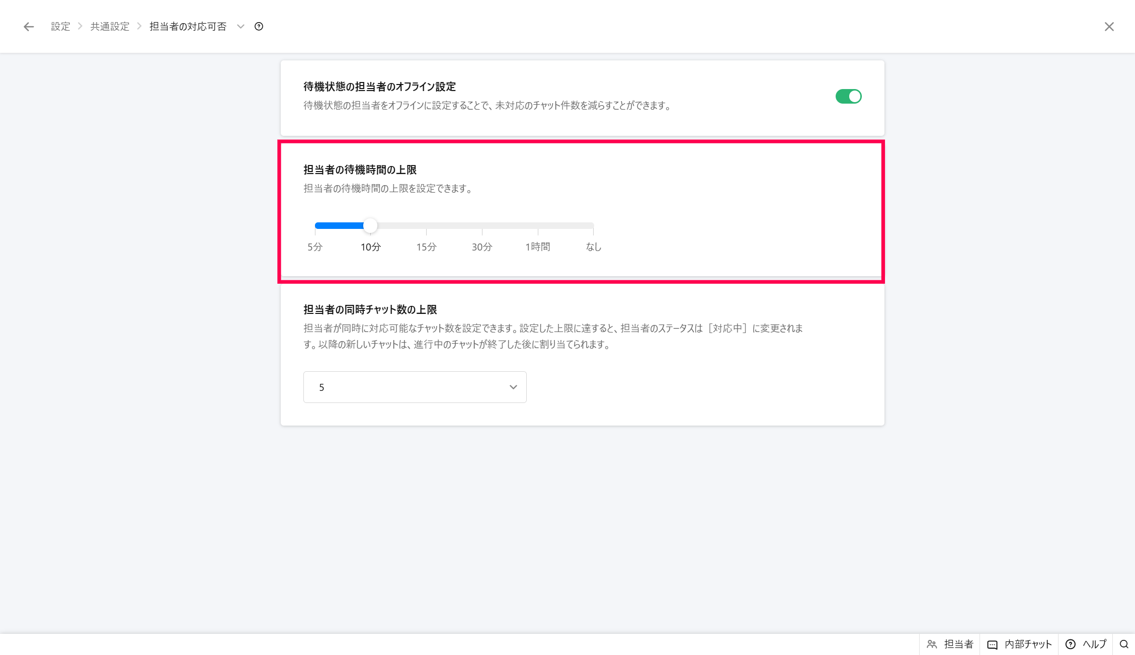 「待機状態」は、共通設定>担当者の対応可否>「担当者の待機時間の上限」で設定している上限時間に基づいており、この時間を超えると「待機時間(黄色)」になります。