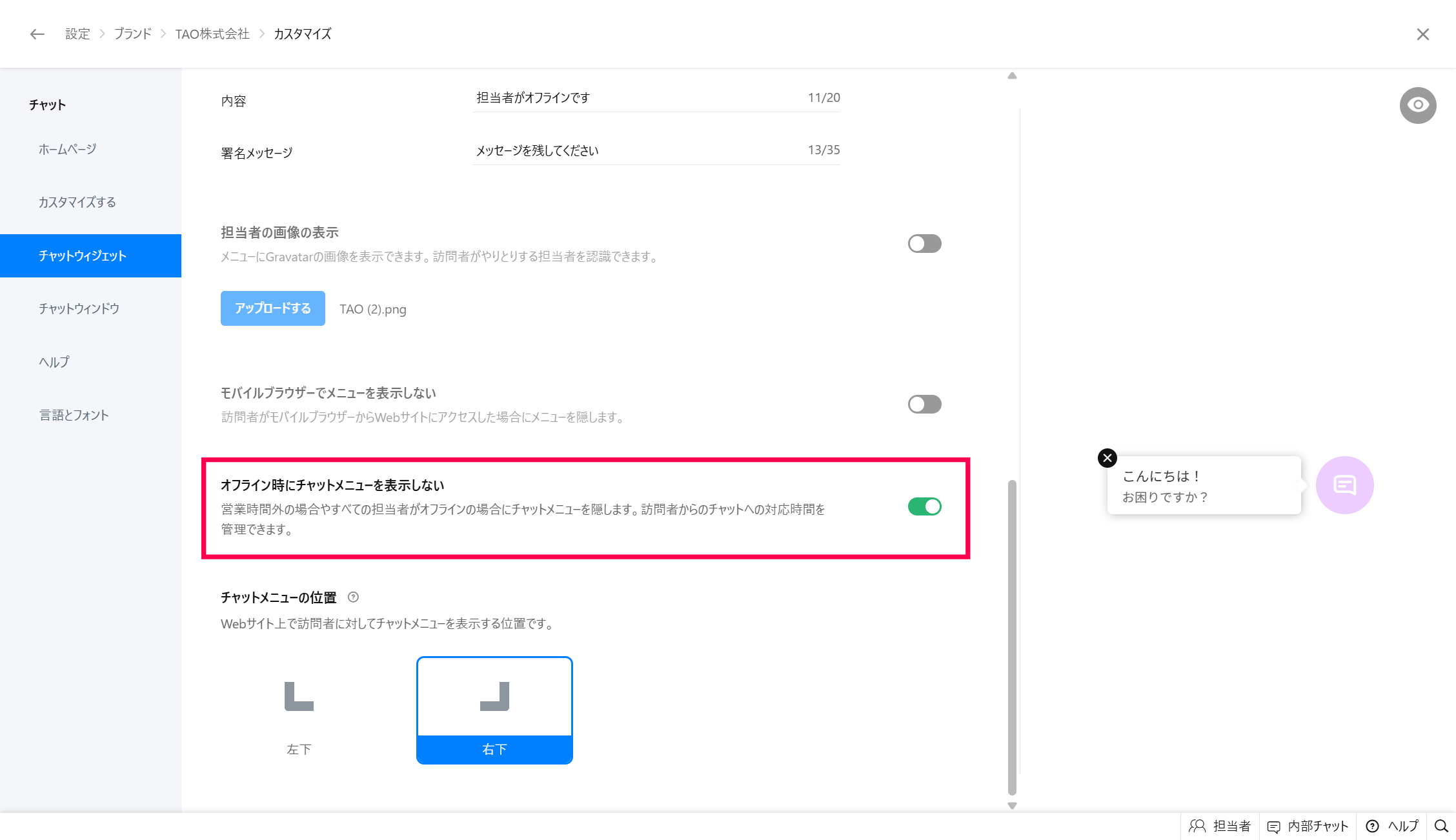 チャットウィジェットの設定画面に、「オフライン時にチャットメニューを表示にしない」というオプションがあり、