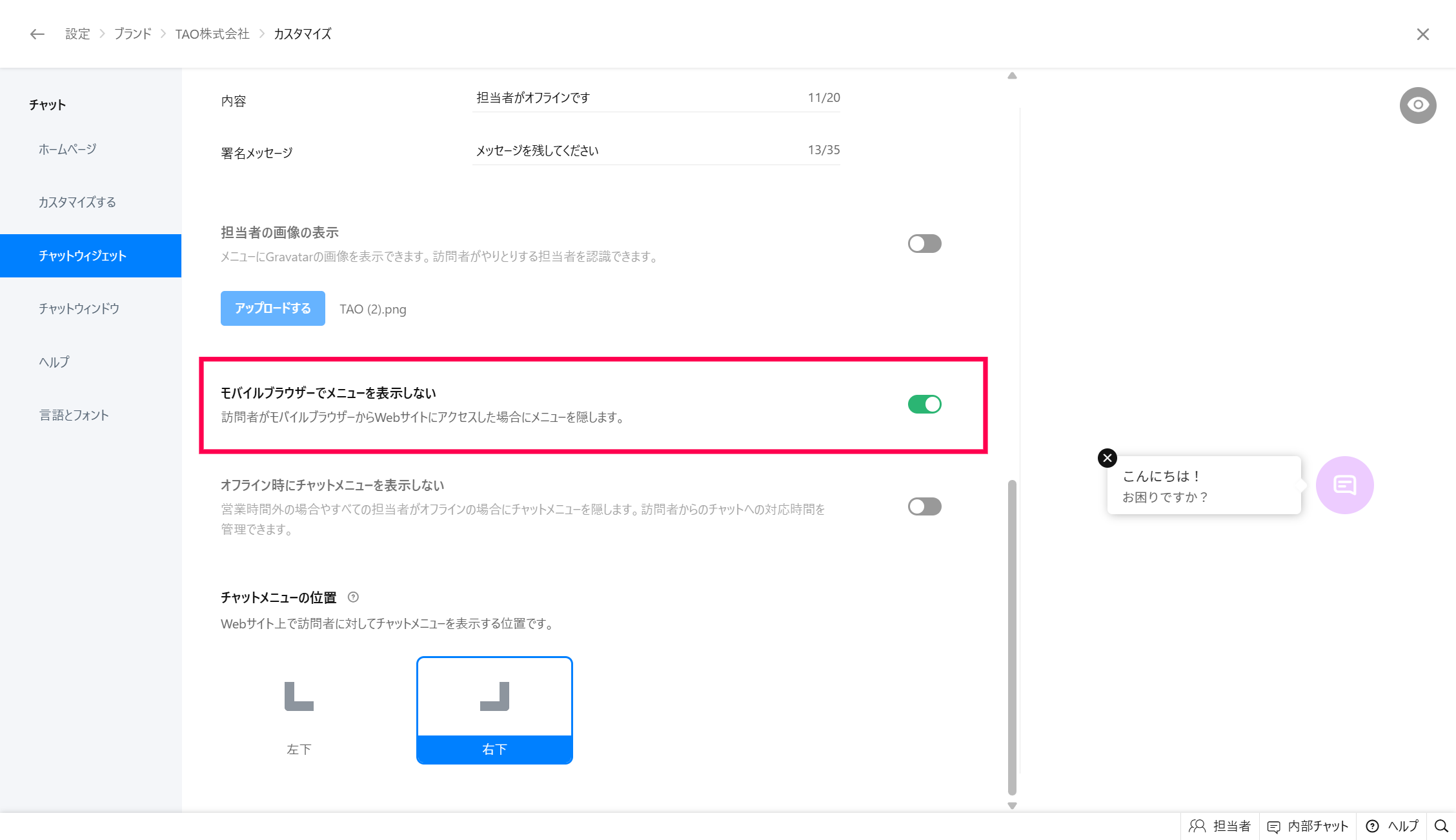 モバイルブラウザーからアクセスした際もチャットウィジェットを表示したい場合は、こちらのオプションを無効化してください。