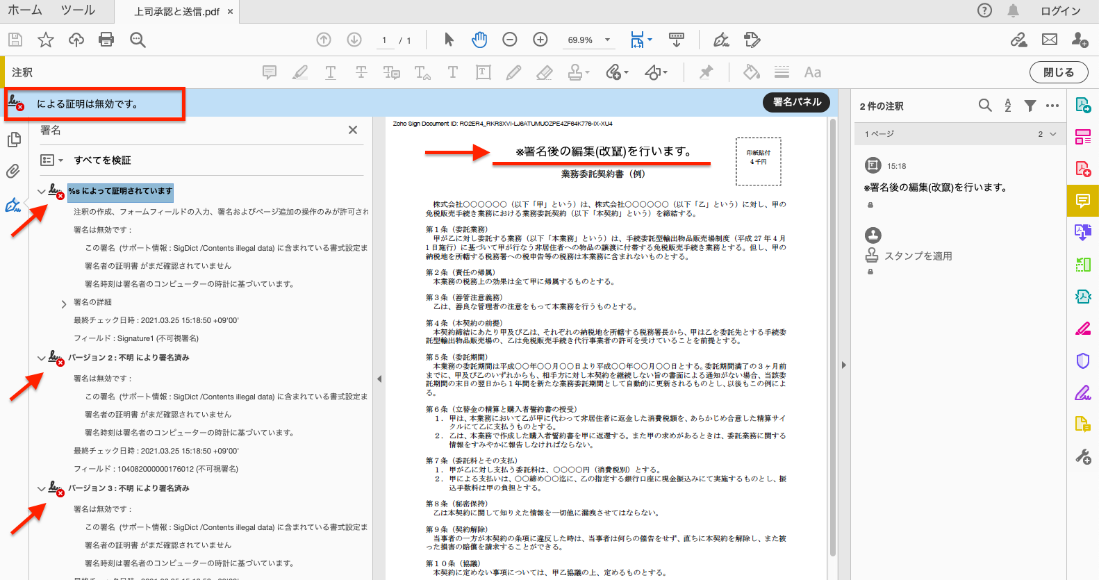もし、完了後にドキュメントに変更が加えられた場合(改竄)、現象としては追加されたすべての証明書が削除され、無効なドキュメントとしてエラーが表示されます。