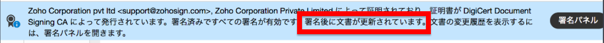 受信者が完了ボタンを押すと、Zoho Signがすべての受信者の証明書を追加します。このプロセスで受信者の署名後に「ドキュメントが更新」されたという情報が提供される通常のプロセスです。(証明書が提供されましたの意味です。)これはドキュメントの改竄を意味しません。