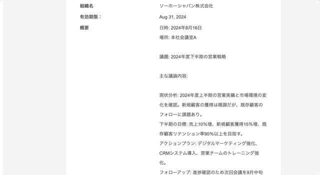 こちらは契約書作成の際のメモの場所から引用されます。例えば、以下のような議事録の概要などを記入できます。