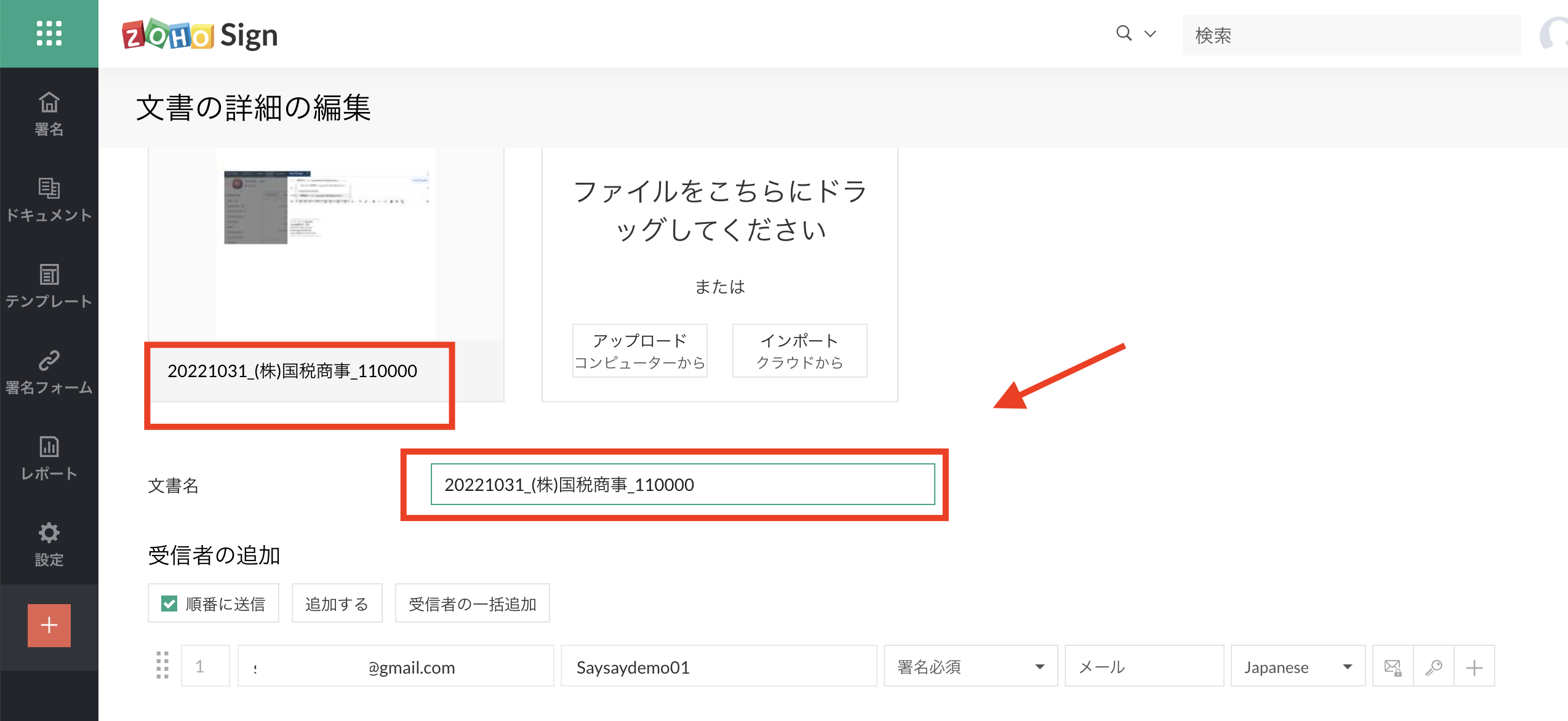 検索機能についてZoho Signでは直接日付検索できませんが、ファイル名に日付を含ませることができます。また、エクセルなどの表ソフトで「ドキュメントURL」整理することもできます。