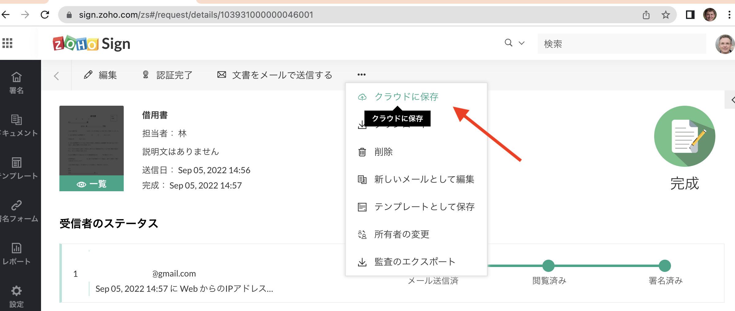 C:署名完了したドキュメントがストレージ管理サービス(Zoho WorkDriveなど)で保存されている場合、そこから共有が可能です。