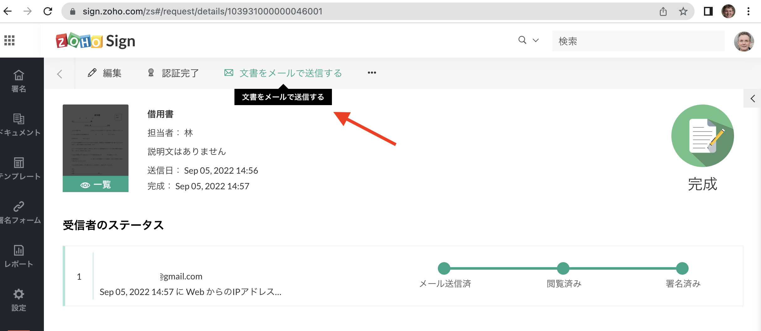送信した後から共有する必要性が発生した場合、文書のメールでの共有機能が使えます。完成済みドキュメントにアクセスして上のボタンをクリックします。