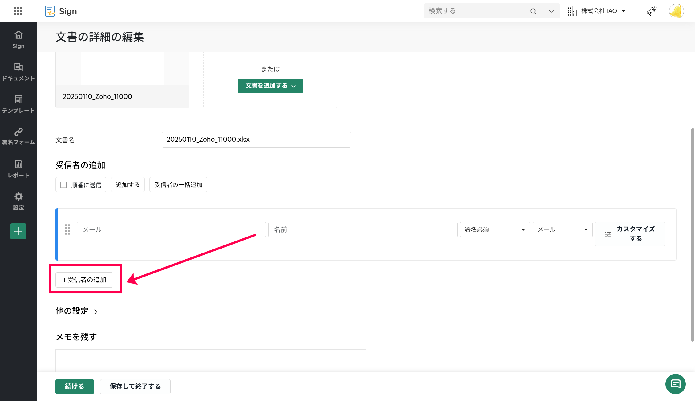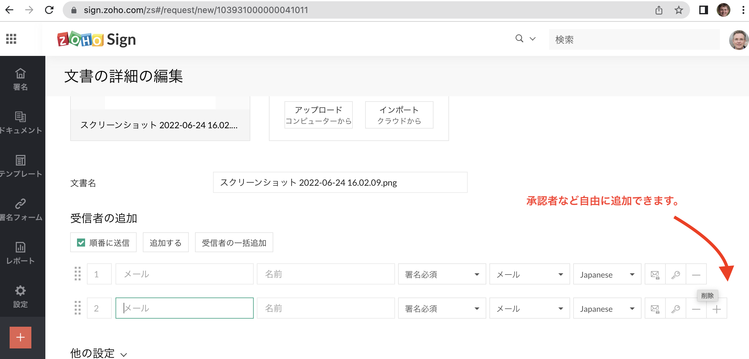 共有先のユーザーを受信者として追加できます。署名の通知も受け取れます。