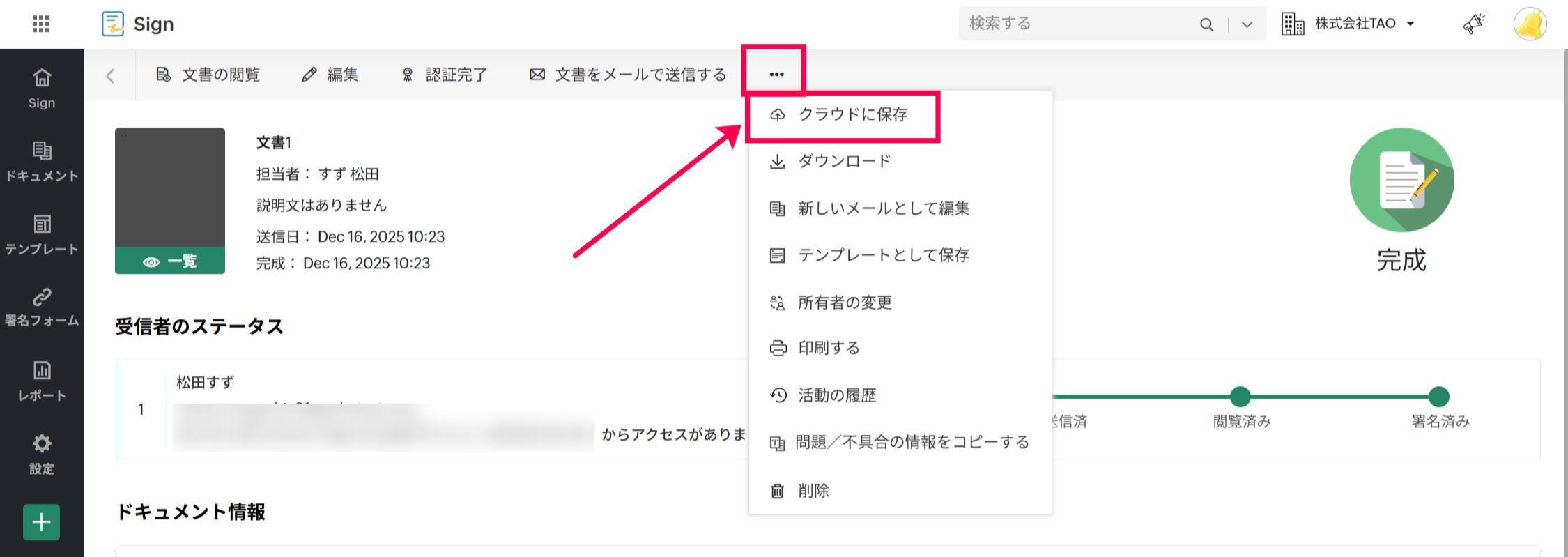 C:署名完了したドキュメントがストレージ管理サービス(Zoho WorkDriveなど)で保存されている場合、「クラウドに保存」オプションから保存→共有が可能です。