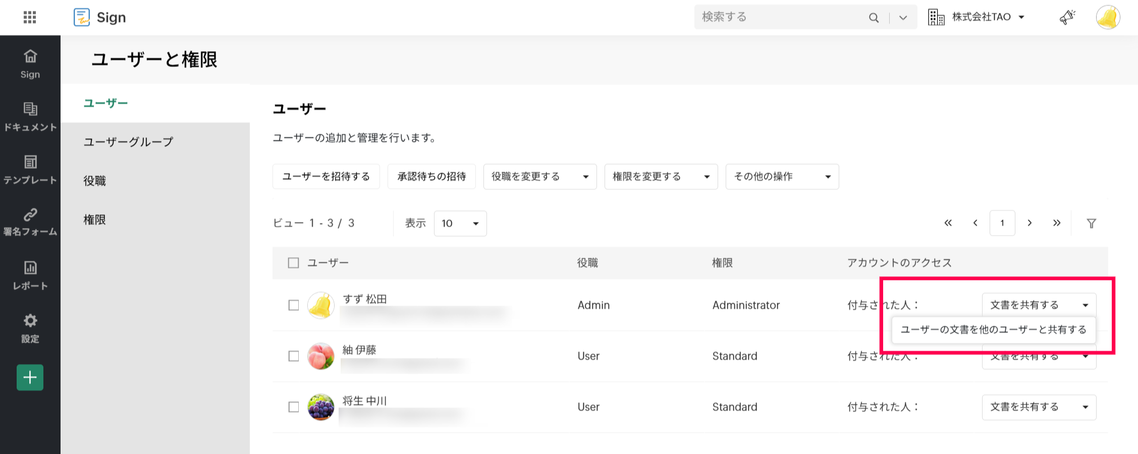 設定>ユーザーと権限>ユーザー画面にて、各ユーザーの「文書を共有する」オプションから選択できます。