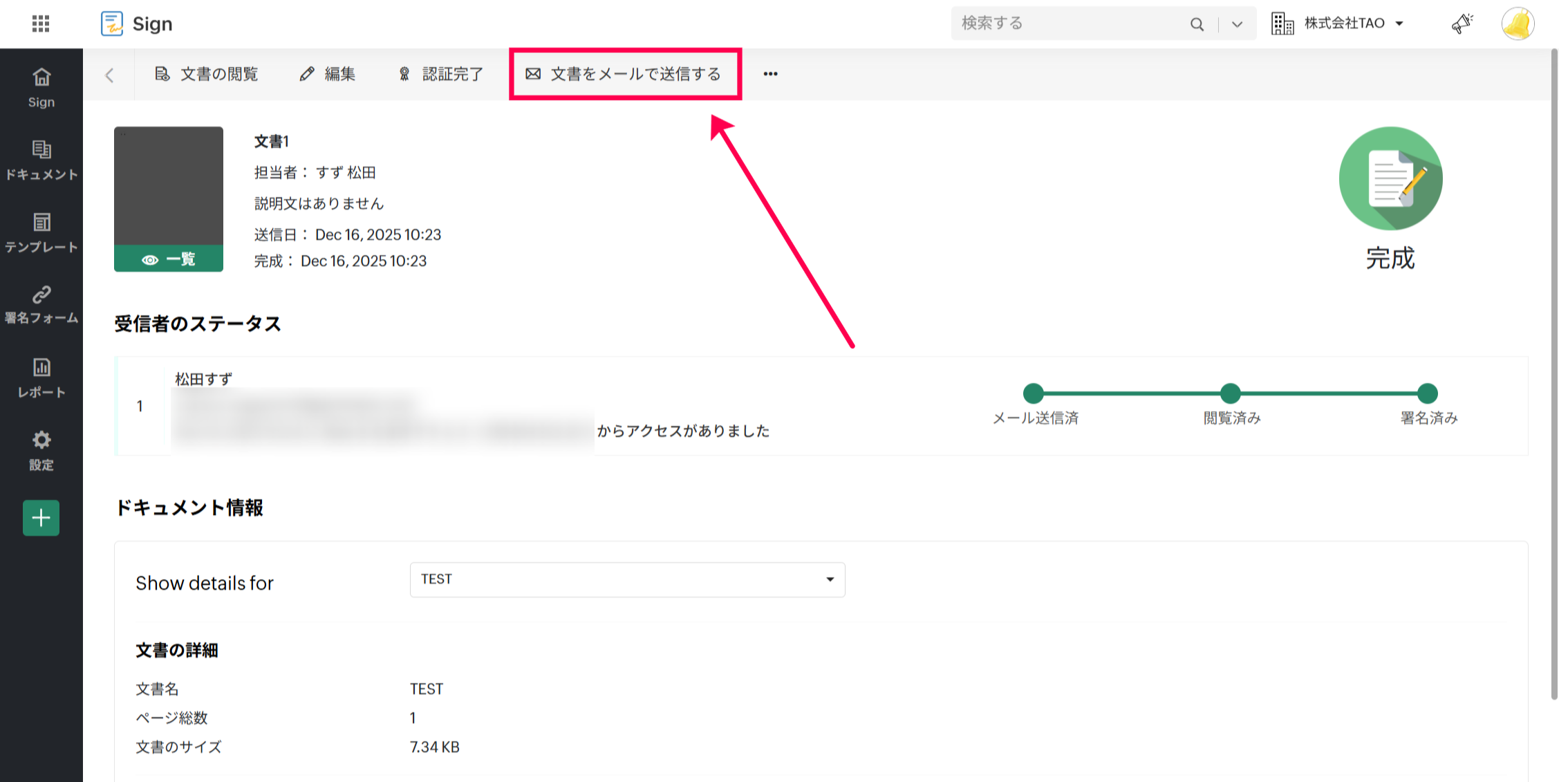 完成済みドキュメントにアクセスして画面上の「文書をメールで送信する」オプションをクリックします。