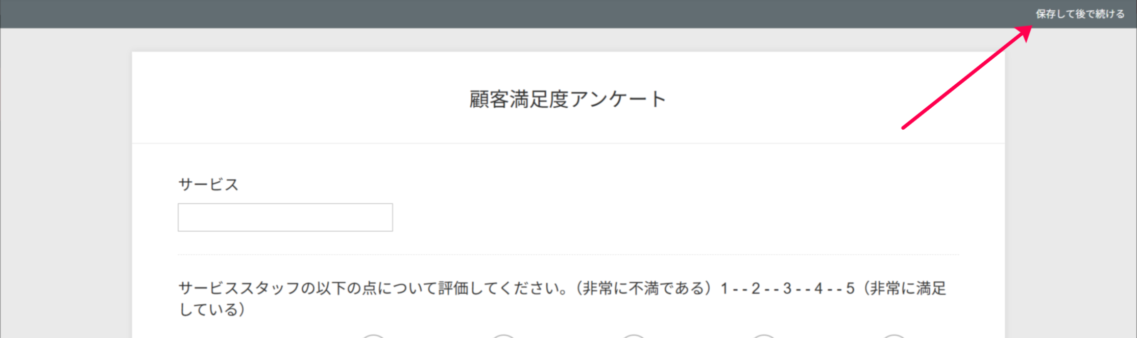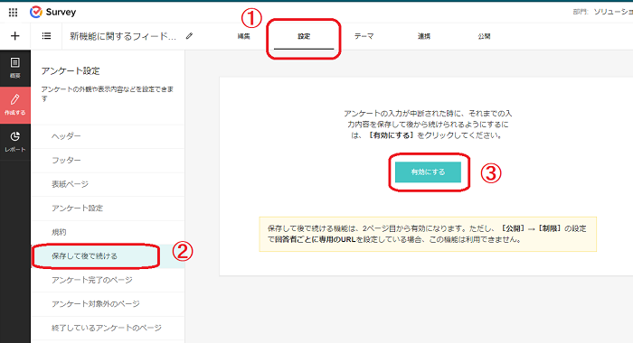 アンケートの回答者が途中で内容を保存し、後で続けられるように設定することができます。