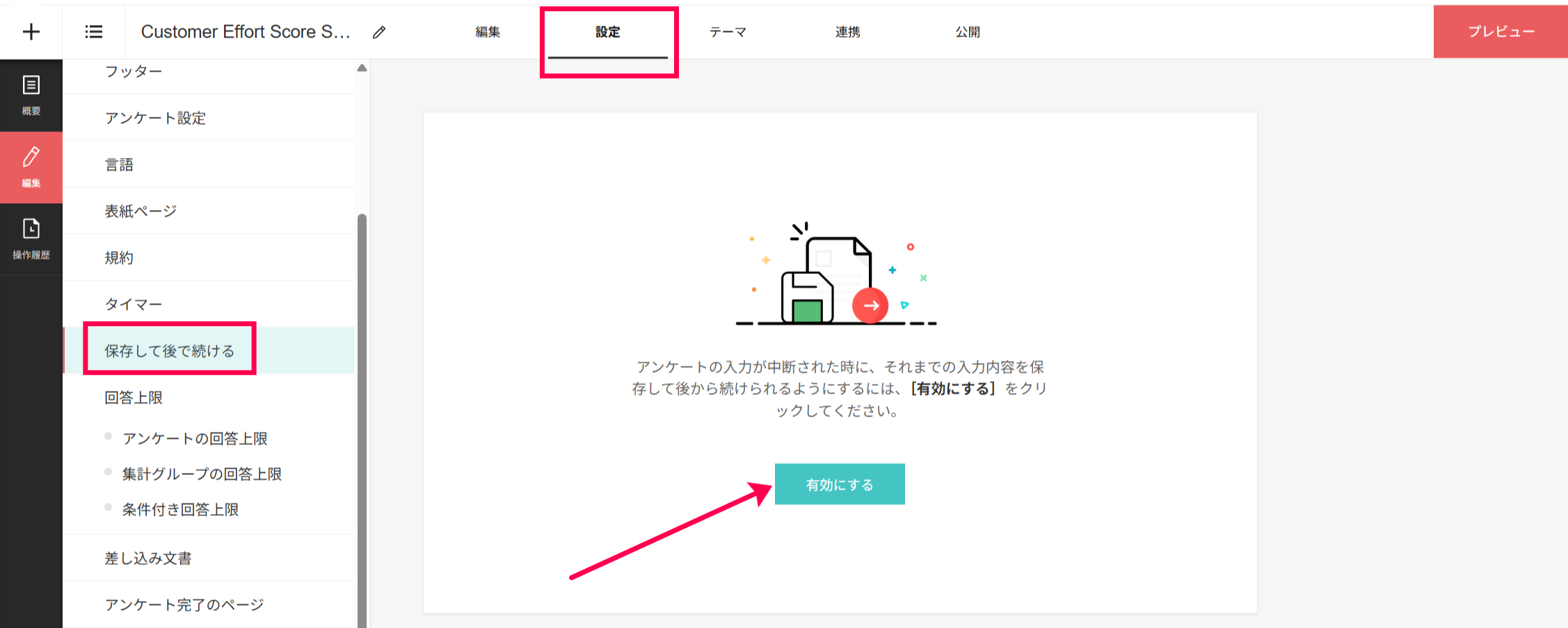 「編集」タブ > 設定 > 保存して後で続ける > 「有効にする」ボタンをクリックしてください。