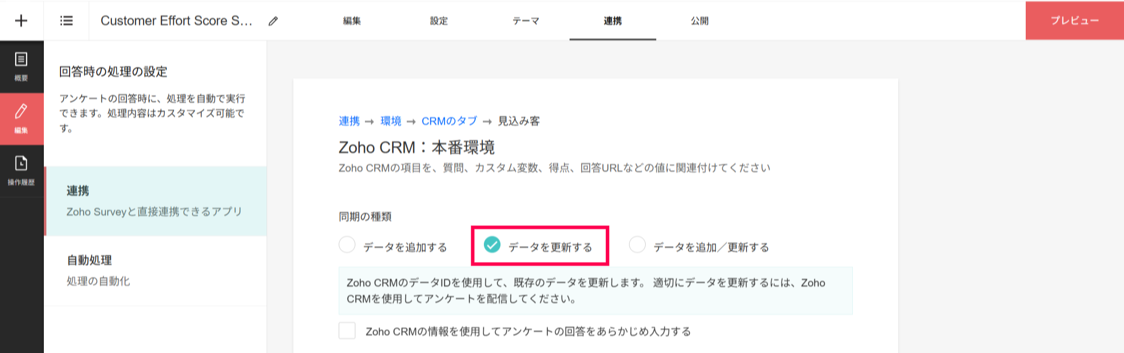 該当のアンケートのビルダー>連携>ZohoCRM連携にて、データの同期の種類を「データを更新する」にしていただき、