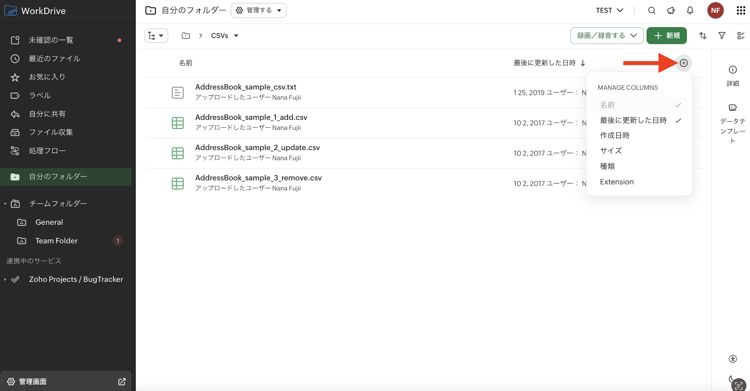 Zoho WorkDriveのフォルダ/ファイル一覧画面に表示される情報を追加、削除したい場合は以下の+より変更が可能です。