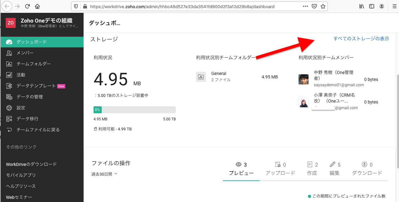・「ストレージ」で「すべてのストレージを表示」をクリックして、各チームフォルダーはメンバーが使用しているストレージを表示できます。