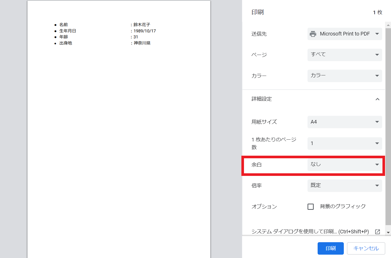 - 印刷メニューから詳細情報をクリックし、余白をなしに変更
