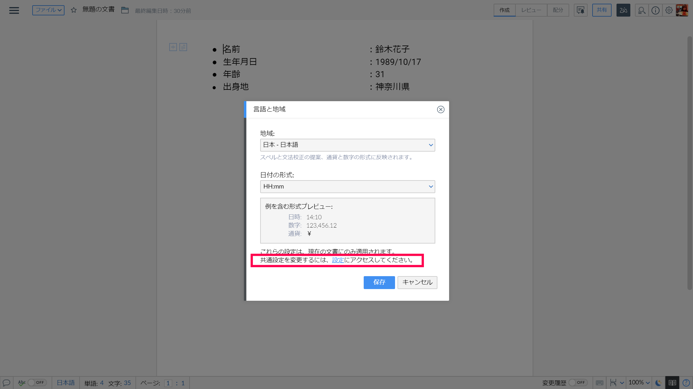 全ての文書に共通設定として設定する場合には、設定にアクセスして設定を行ってください。