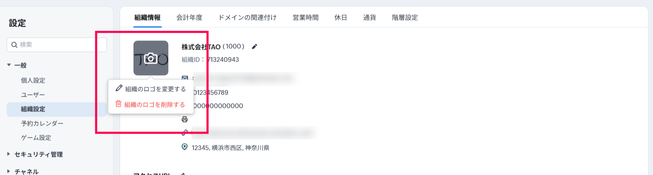 組織のロゴは、設定>一般>組織情報より設定可能です。