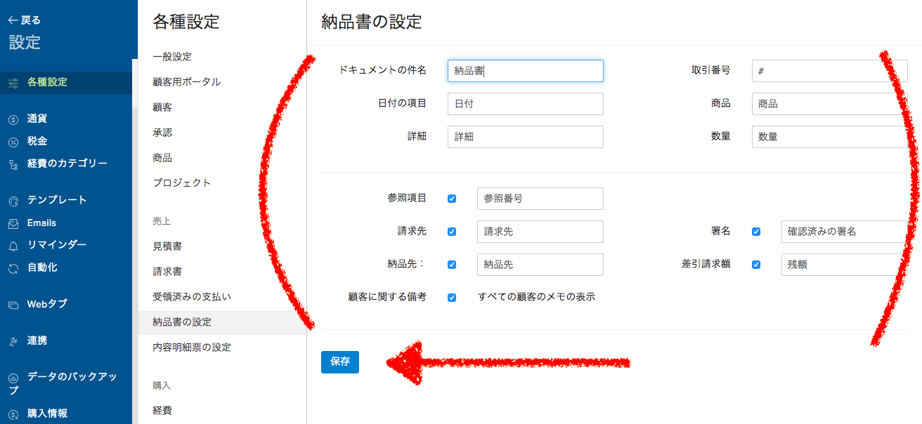 納品書に表示する項目の種類や内容を設定できます。