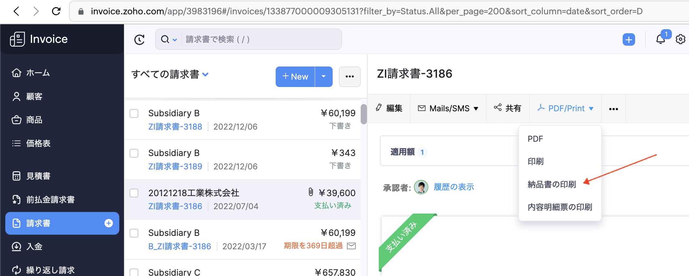 請求書の「PDF/Print」から「納品書の印刷」を選択してください。