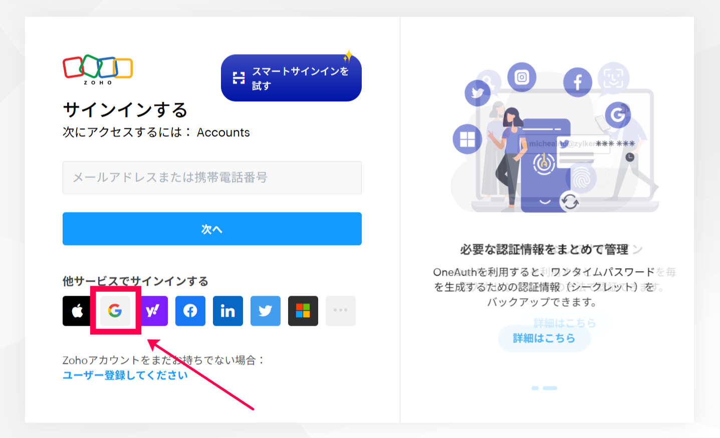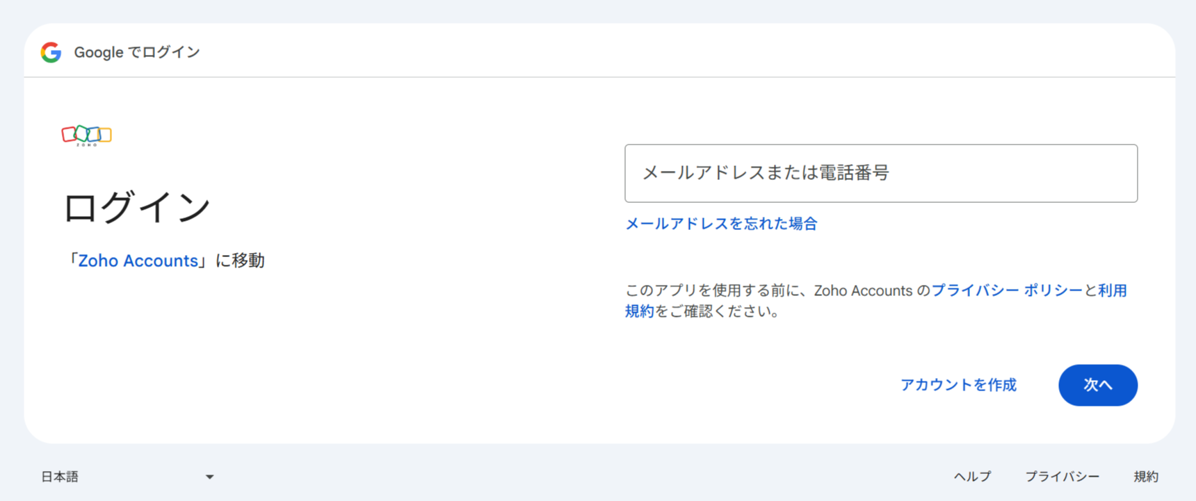 Googleアカウントでユーザー登録をした場合は、以下の手順でZohoサービスにログインできます。